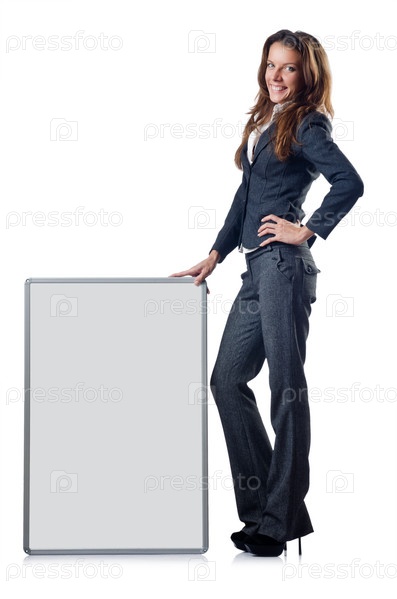 Бизнес-леди с пустым баннером на белом фоне