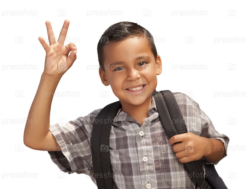 Счастливый латиноамериканский мальчик, готовый к школе, на белом фоне
