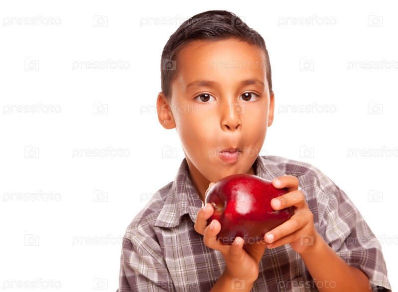 Прелестный латиноамериканский мальчик ест большое красное яблоко