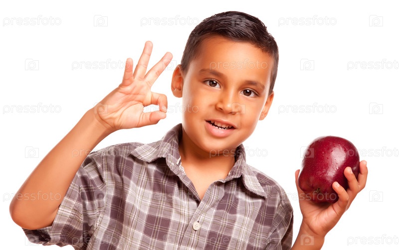 Прелестный латиноамериканский мальчик с яблоком показывает, что все отлично