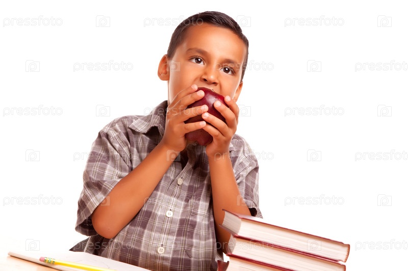 Прелестный латиноамериканский мальчик ест большое красное яблоко