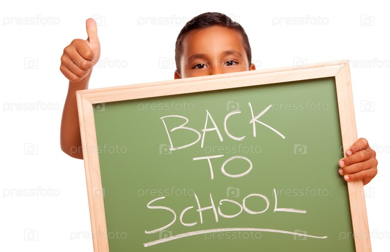 Милый латиноамериканский мальчик держит доску с надписью СНОВА В ШКОЛУ