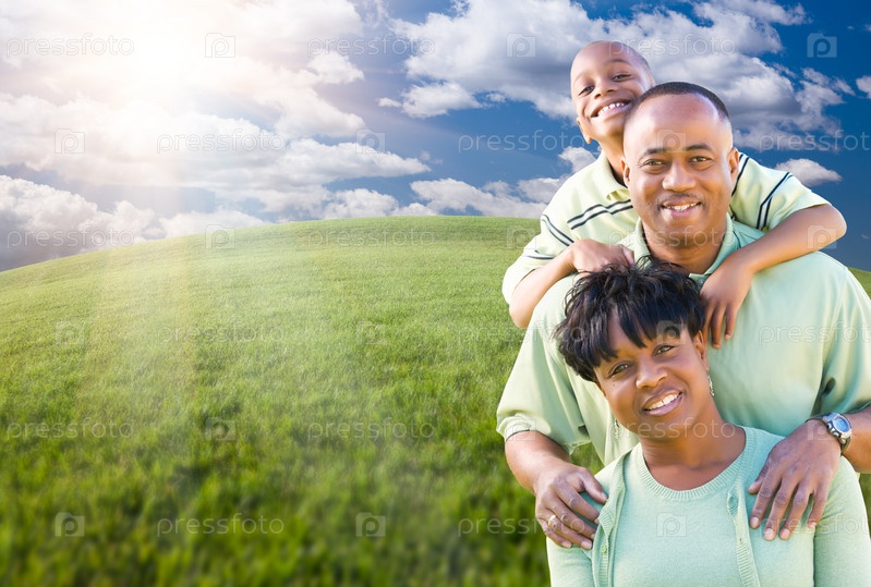 Семья на фоне облаков, неба и поля