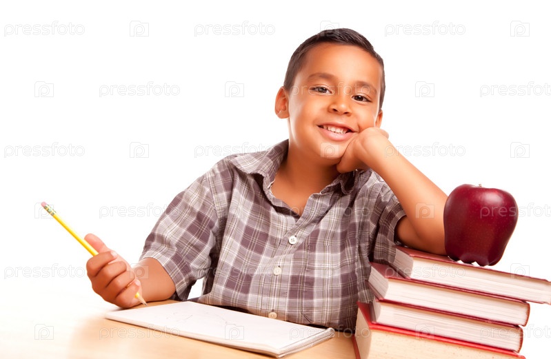 Симпатичный латиноамериканский мальчик с книгами, яблоком, карандашом и бумагой