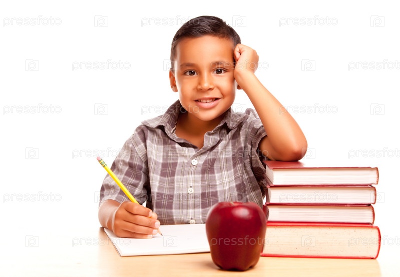 Симпатичный латиноамериканский мальчик с книгами, яблоком, карандашом и бумагой