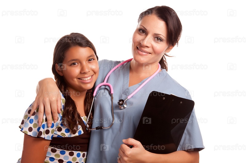 Латиноамериканская девочка и женщина-врач, изолированные на белом