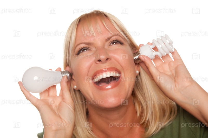 Смешная женщина с энергосберегающей лампочкой и обычной