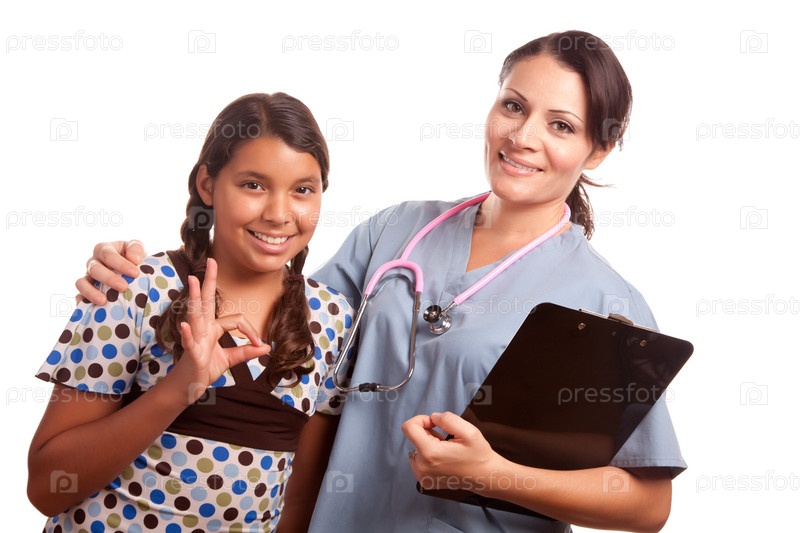 Латиноамериканская девочка и женщина-врач, изолированные на белом