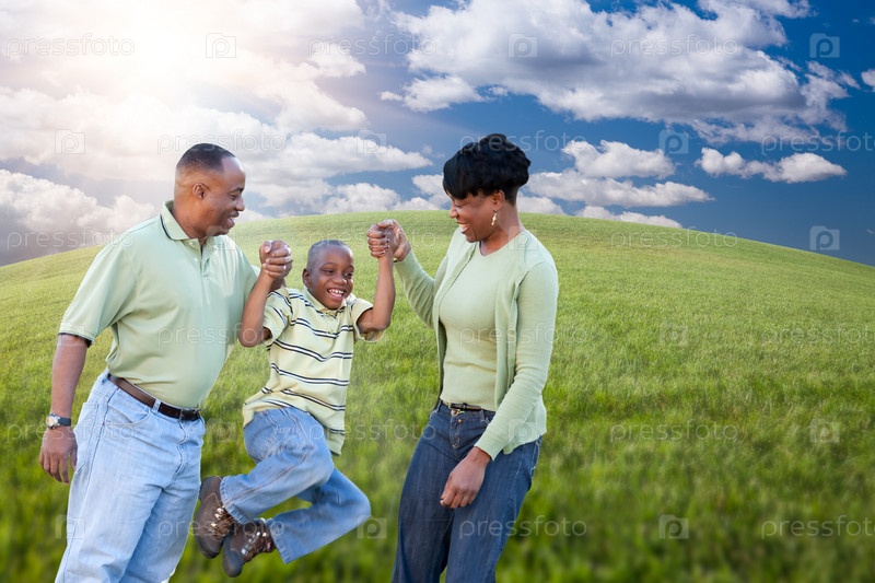 Счастливая семья на поле на фоне облачного неба