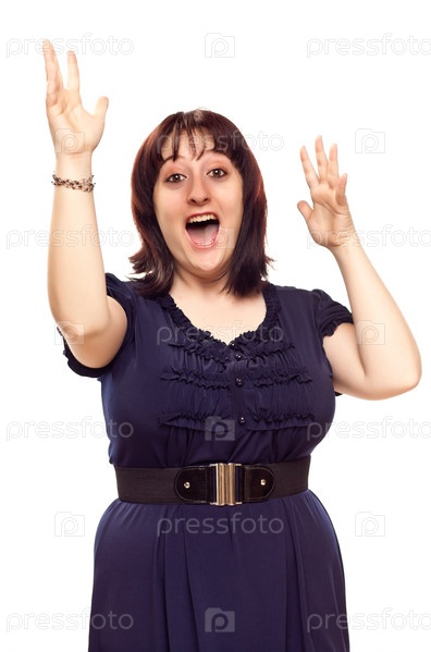 Счастливая молодая женщина с руками в воздухе на белом фоне