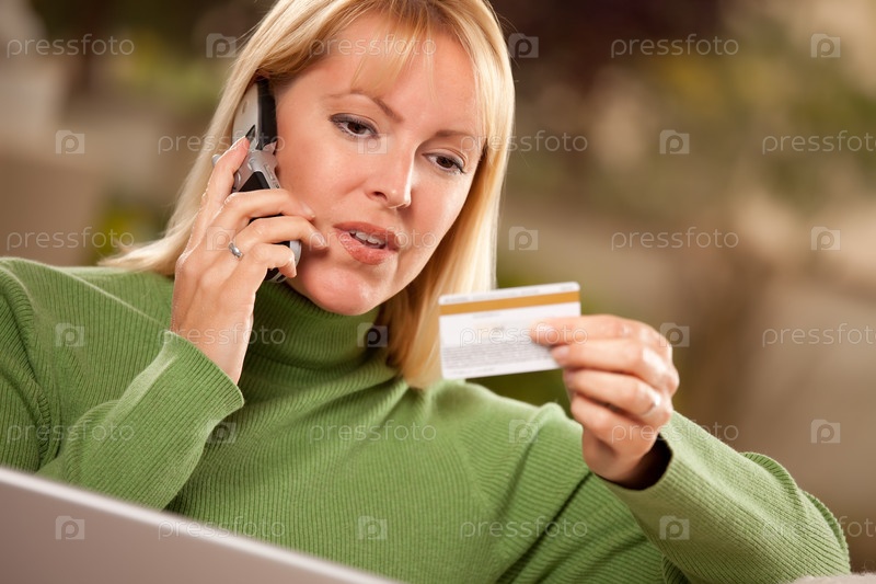 Жизнерадостная женщина с кредитной картой, ноутбуком и телефоном