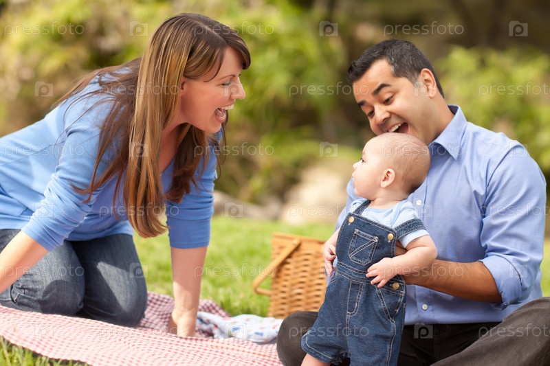 Счастливая семья смешанного происхождения играет в парке