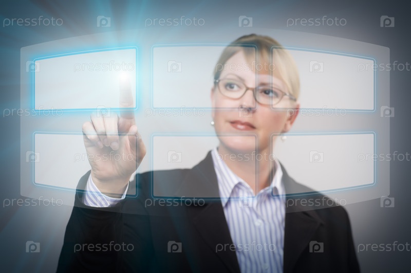 Деловая женщина нажимает пальцем на кнопки на сенсорном экране