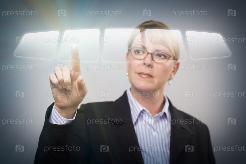 Деловая женщина нажимает пальцем на кнопки на сенсорном экране