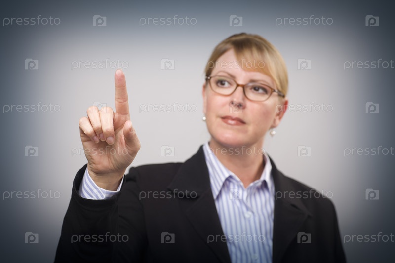 Деловая женщина нажимает пальцем на кнопки на сенсорном экране