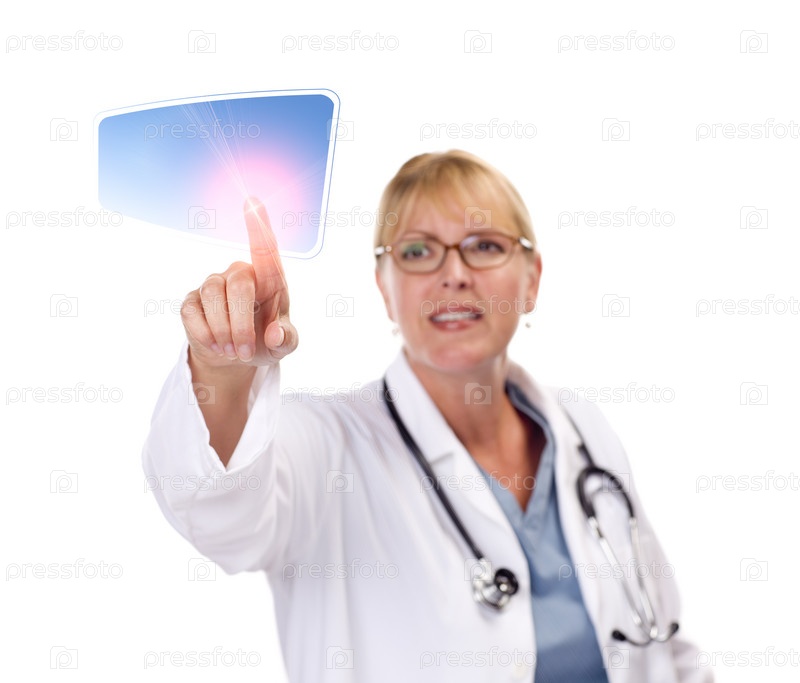 Женщина-врач нажимает кнопку на сенсорном экране