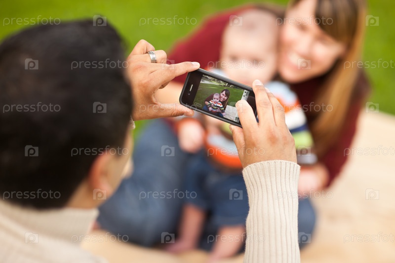 Счастливые родители смешанной расы и ребенок фотографируются для портрета