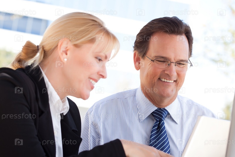 Бизнесмен с коллегой и ноутбуком на открытом воздухе
