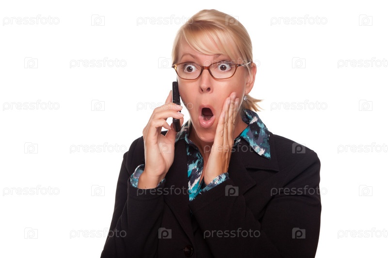 Шокированная блондинка с сотовым телефоном