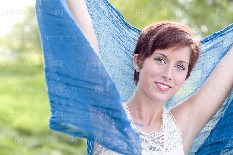Портрет рыжеволосой молодой женщины с голубыми глазами на свежем воздухе