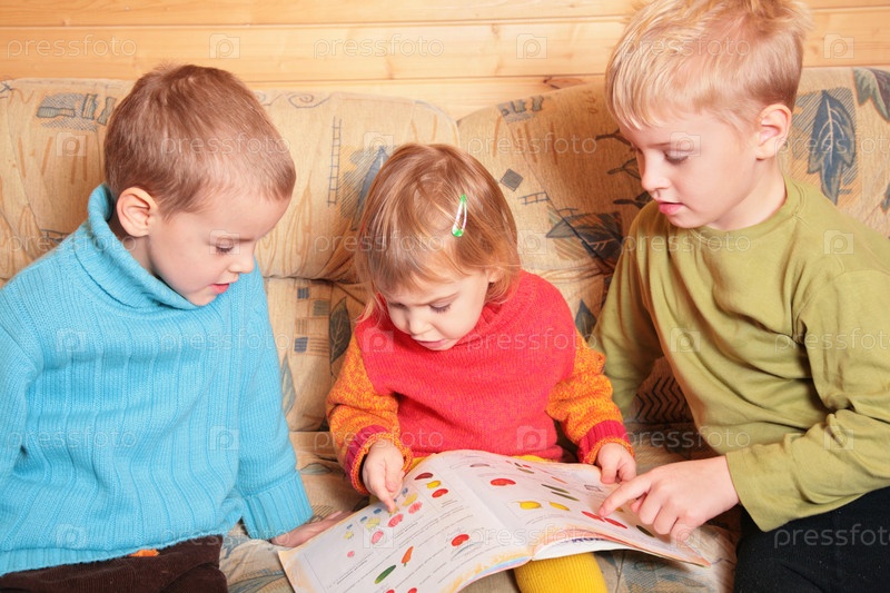 Дети читают книгу на диване в комнате с деревянными стенами