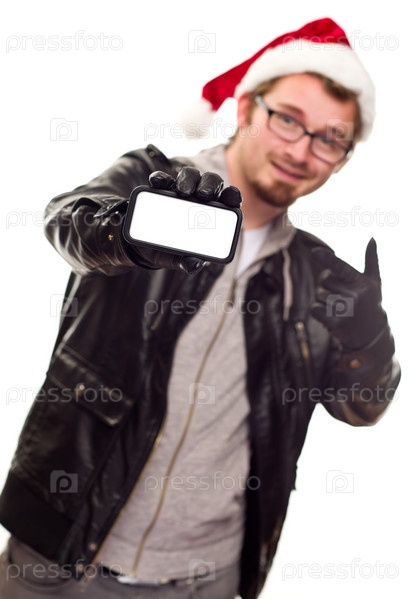 Мужчина в шапке Санты держит сотовый телефон с пустым экраном