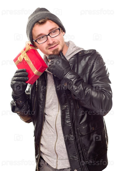 Тепло одетый красивый молодой человек с подарком