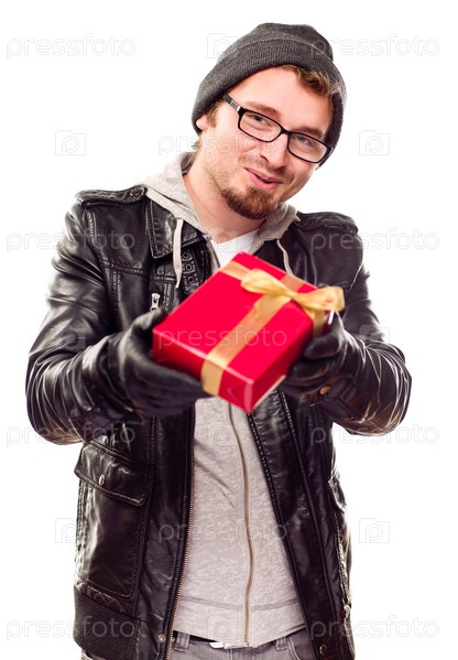 Тепло одетый красивый молодой человек с подарком