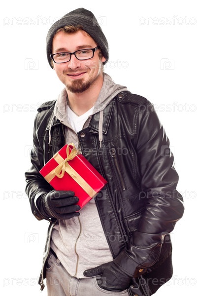 Тепло одетый красивый молодой человек с подарком