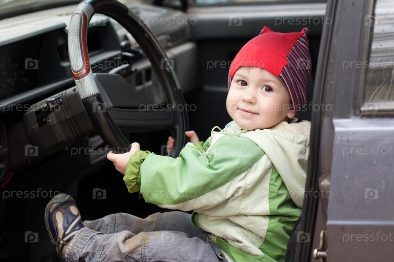 Маленький мальчик сидит за рулем