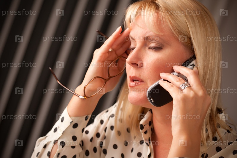 Блондинка в стрессовом состоянии с мобильным телефоном