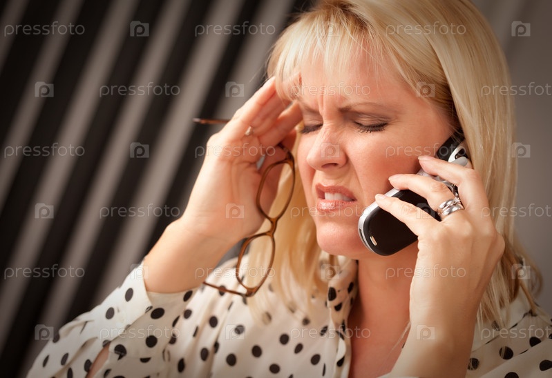 Блондинка в стрессовом состоянии с мобильным телефоном