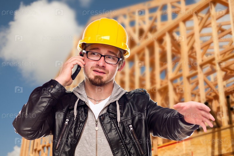 Подрядчик в шлеме с телефоном перед домом