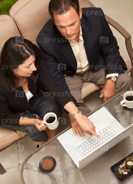 Мужчина и женщина с ноутбуком и кофе