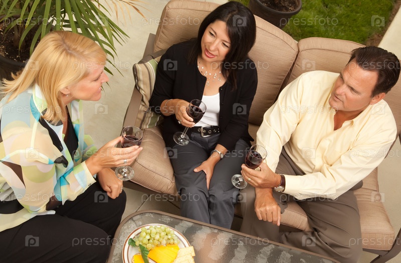Трое друзей наслаждаются вином на крыльце