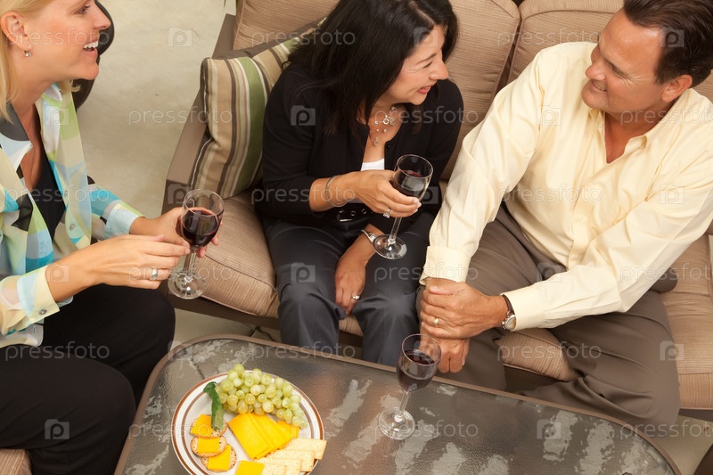 Трое друзей наслаждаются вином в патио