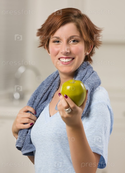 Симпатичная рыжеволосая женщина с яблоком