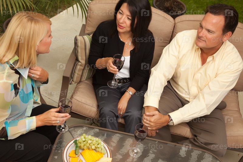 Трое друзей наслаждаются вином в патио