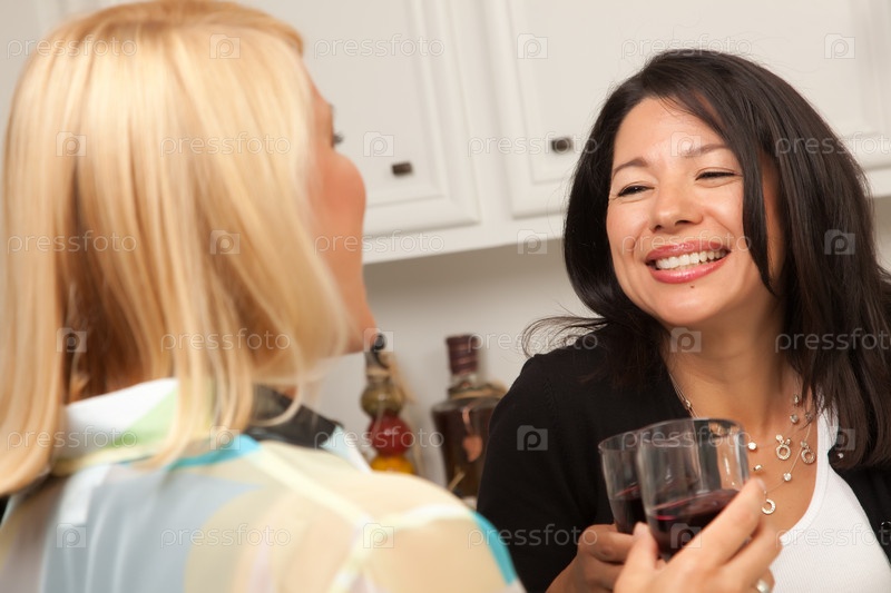 Две подруги пьют вино в кухне