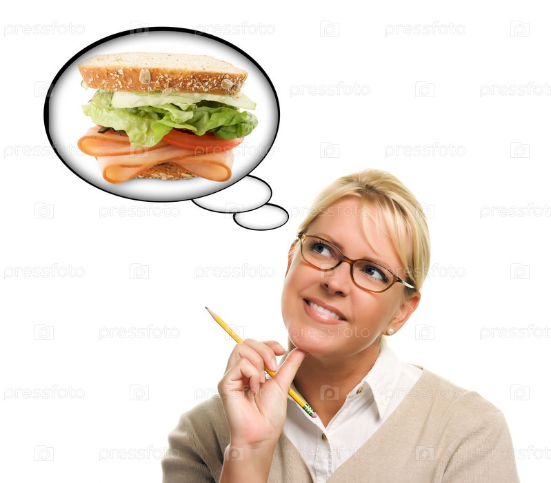 Голодная женщина мечтает о большом свежем сэндвиче