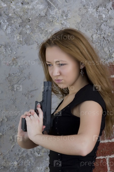 Девушка с пистолетом на фоне кирпичной стены