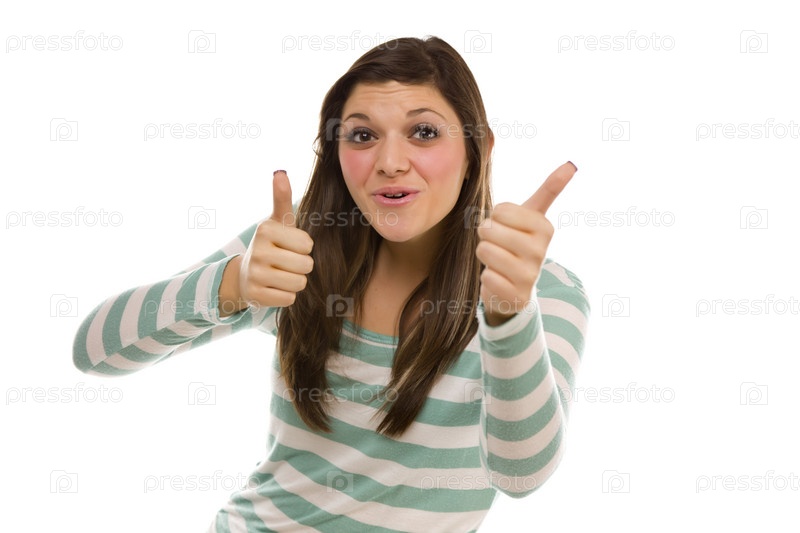 Привлекательная улыбающаяся этническая женщина с поднятыми большими пальцами на белом фоне