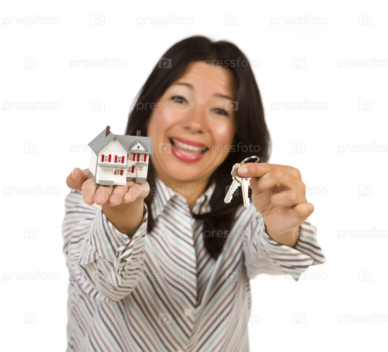 Привлекательная женщина смешанного происхождения, держащая маленький дом и ключи