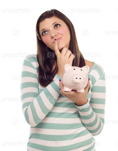 Мечтательная девушка смешанного происхождения с копилкой на руке на белом фоне