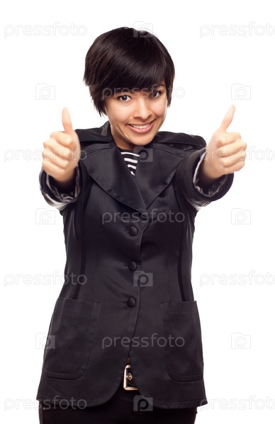 Счастливая девушка смешанного происхождения с поднятыми большими пальцами на белом фоне