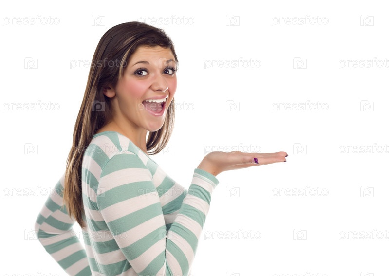 Этническая девушка с ладонью в сторону на белом фоне