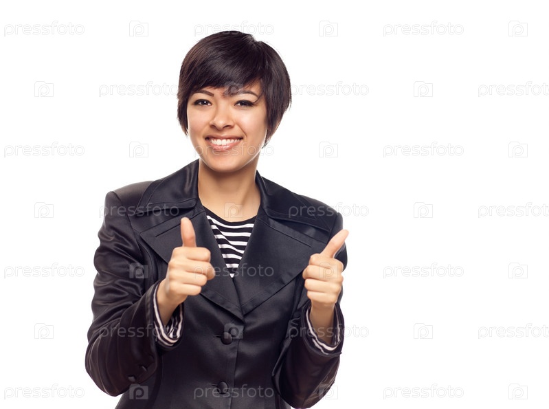Счастливая девушка смешанного происхождения с поднятыми большими пальцами на белом фоне