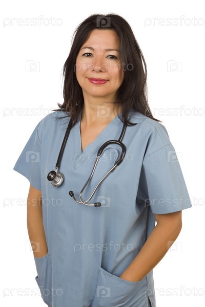 Привлекательная улыбающаяся этническая женщина-врач или медсестра на белом фоне