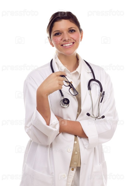 Привлекательная улыбающаяся этническая женщина-врач или медсестра на белом фоне