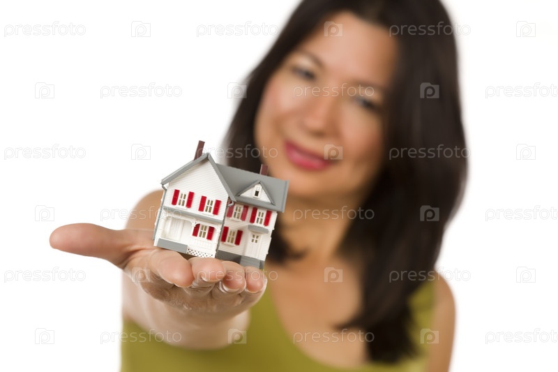 Этническая женщина с домиком на руке на белом фоне